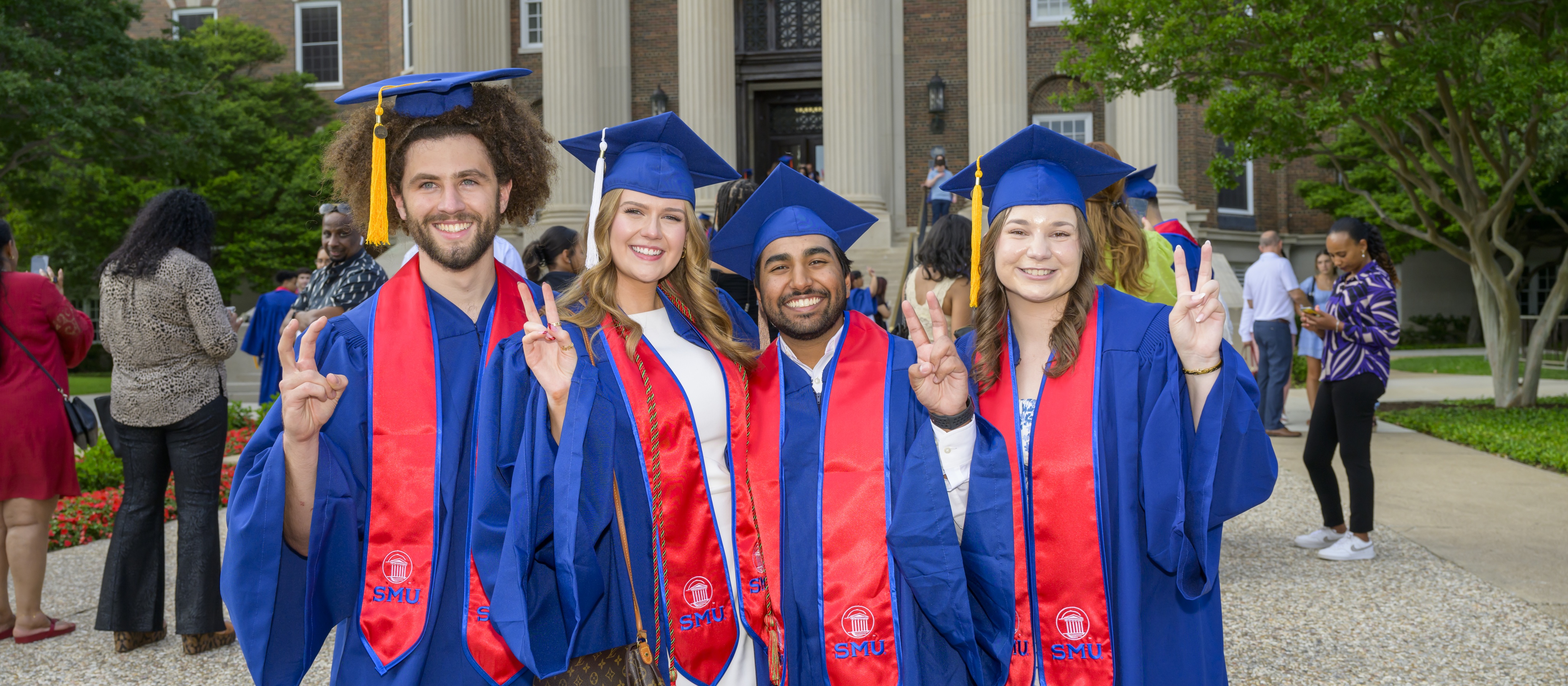 On Saturday morning, the All-University May Commencement assembles degree candidates from all of SMU’s schools and professional programs. The Commencement speaker will offer their congratulations to our newest class of graduates and the University president will confer degrees. Doctoral students (Ph.D., Ed.D., DE, and DLS) will receive recognition as they cross the stage. All other students receive individual recognition at their school/department ceremonies. At the conclusion of the ceremony, “Varsity” is played and a prayer is said for the new alumni.