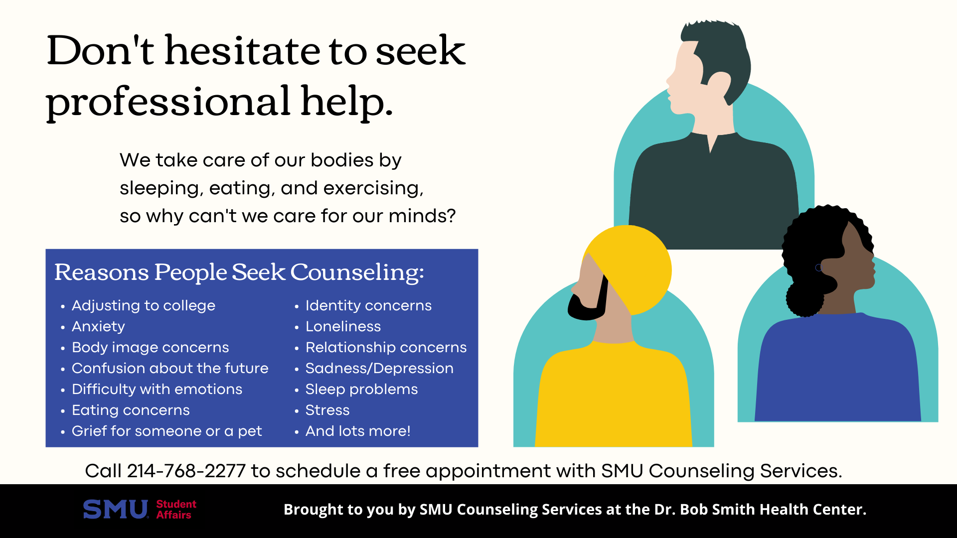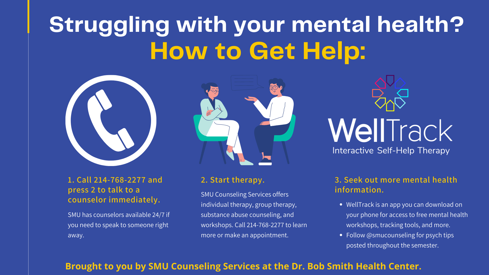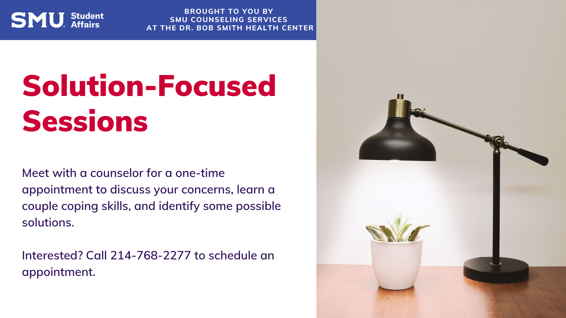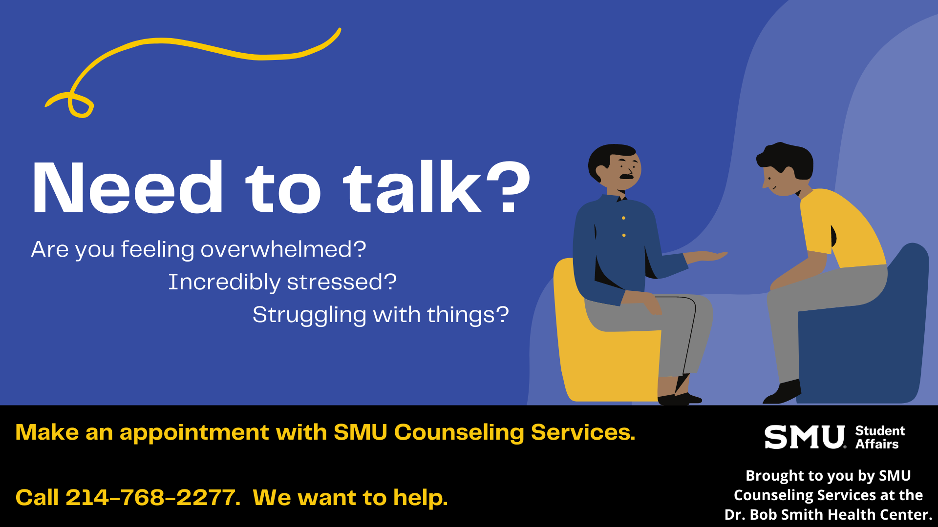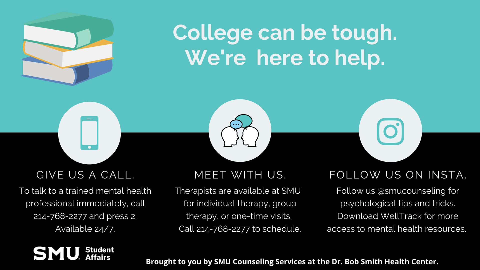 Call 214-768-2277 to schedule your first visit with Counseling Services. All SMU students are eligible to receive free services at the counseling center, regardless of insurance.