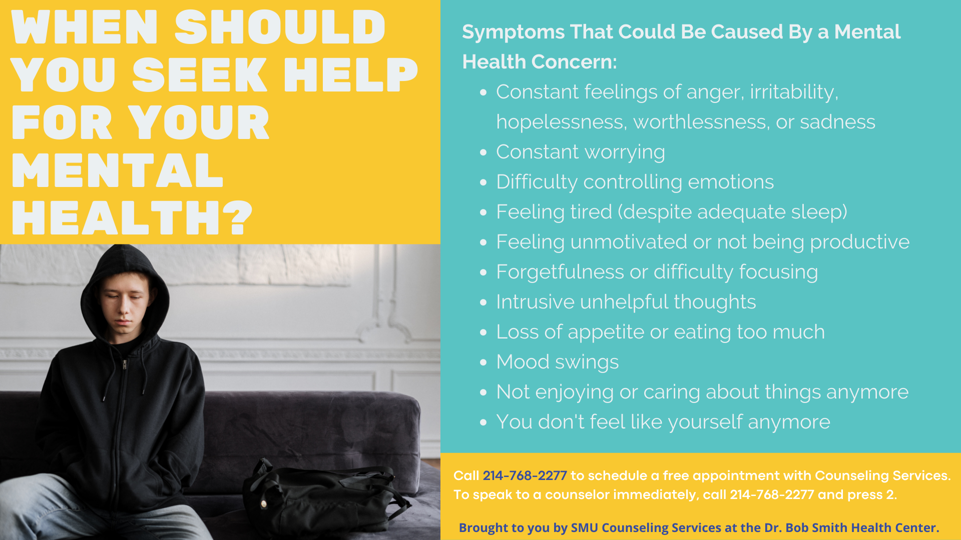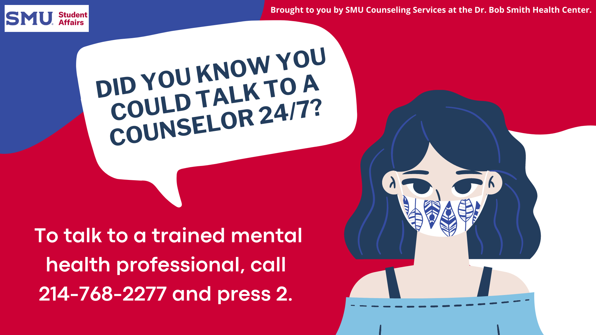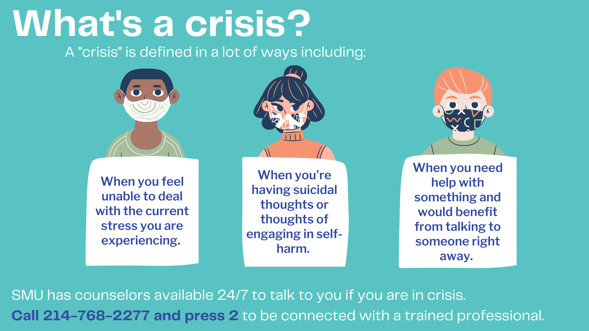 If you are in crisis at any time and need to speak to an on-call counselor 24/7, call 214-768-2277 and select option 2.