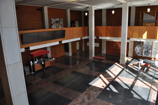The naturally lit, glass-filled Bob Hope Lobby provides an intriguing visual backdrop for various performances, both formal and informal. Located at the Bishop Boulevard entrance to the Owen Arts Center, the lobby is the entrance to not just the Bob Hope Theatre but also Caruth Auditorium.