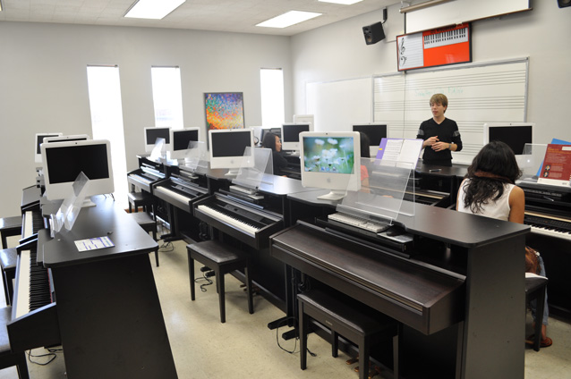 The electronic keyboard laboratory, used for class instruction in piano, theory and improvisation, is equipped with Yamaha 88-key digital pianos, an MlC 100 Communications Center, computers at each station and a variety of sequencers, tone modules and software applications.